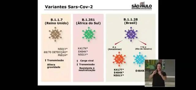 巴西权威医疗科研机构布坦坦研究所所长迪马斯 科瓦斯表示,在巴西、英国及南非出现的B.1.1.7、B.1.315和B.1.1.28三种变异病毒均已在巴西新冠肺炎患者身上被检测到。研究人员表示,英国发现的变异病毒具有更强的传染性且可加重感染症状,其致死率较普通病毒高出64%;南非发现的变异病毒基因组携带E484K突变,这个突变有可能增强新冠病毒的传染性,并可能降低人体内抗体的有效性;同样携带有E484K突变的P.1变异病毒是在巴西传播最为广泛的,其危险程度与以上两种变异病毒相当。