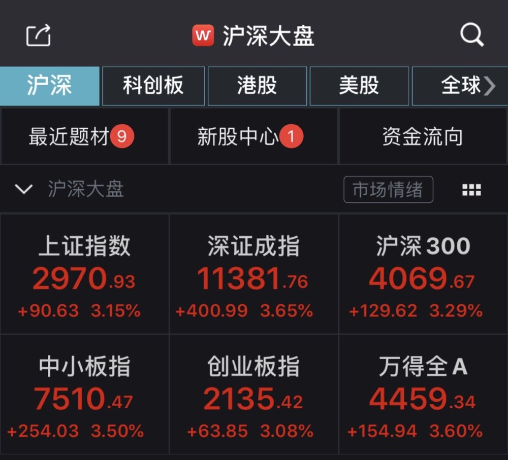 截至收盘,沪指报2970.93点,涨幅3.15%,成交量3972.44亿元;深成指报11381.76点,涨幅3.65%,成交量6320.86亿元;创业板指报2135.42点,涨幅3.08%。