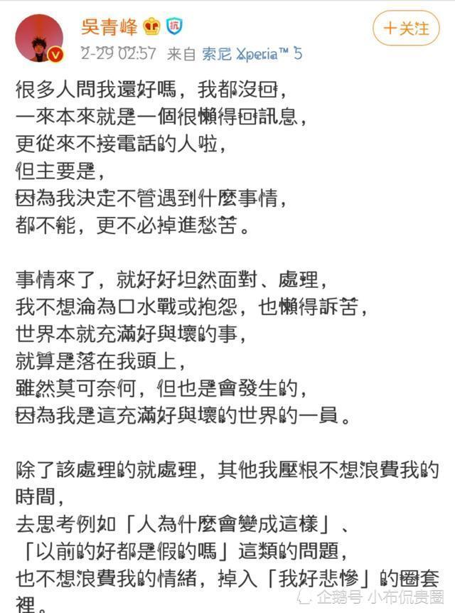 今日凌晨,前苏打绿主唱吴青峰在社交平台发文,内容令人心酸。“人为什么会变成这样”“以前的好都是假的吗”的这些想法,足以看出吴青峰这次所受的打击之大。