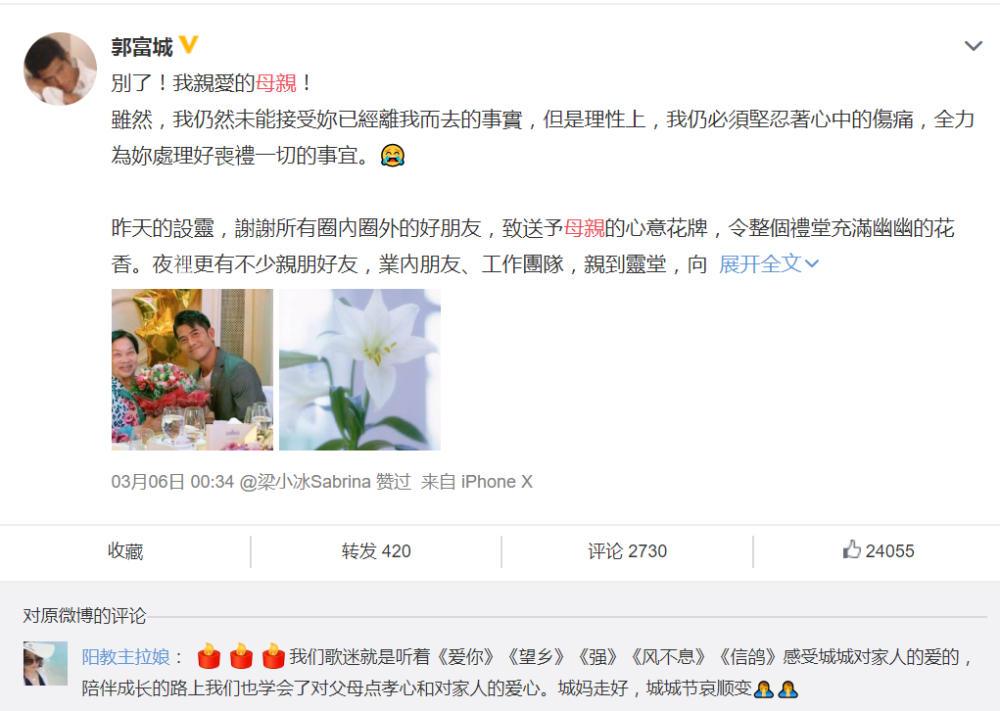 同样沉浸在这样的丧母之痛中的还有另一位天王,郭富城。在2月7日,郭富城的母亲在家中去世,享年90岁,在3月5日,郭富城在香港举办母亲的葬礼,妻子方媛也是同样披麻戴孝现身,当天郭富城就在微博上发文表示自己虽然悲痛,但是还是要料理好母亲的后事,也感谢到场的亲友,以及慰问的朋友们。粉丝也纷纷在底下应援,希望天王能够节哀。