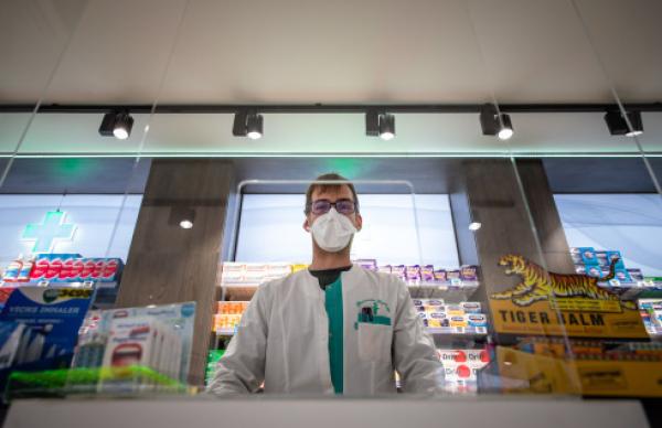 4月2日,在法国巴黎一家药店,收银台安装了防护板。新华社 图
