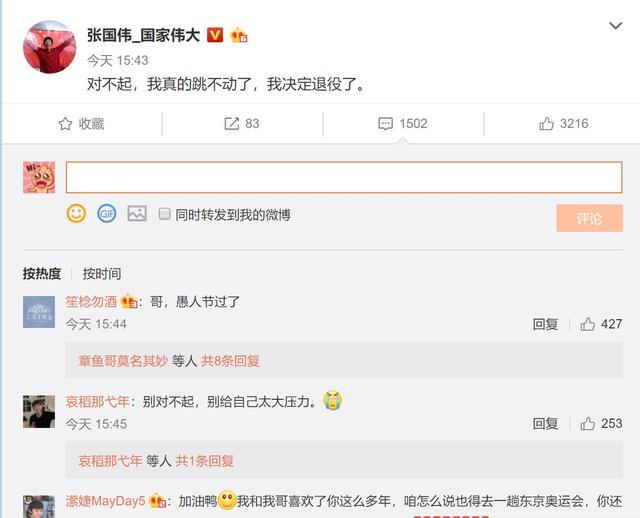 北京时间4月5日,张国伟宣布退役,他在个人平台写道:对不起,我真的跳不动了,我决定退役了。下面网友评论:哥,愚人节过了。可见网友不舍张国伟告别体坛,也有网友暖心评论:别对不起,别给自己太大压力。近年来,张国伟凭借其搞笑幽默的性格走红,但是由于受伤病困扰,其实他在运动场上的竞技状态一直在走下坡路,虽然在这期间也曾出现过回暖时刻,但是最后还是没能实现成为第一个跳过2米4的黄种人的梦想。