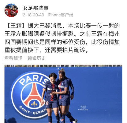 赛后,据知名体育博主“女足那些事”消息,王霜左脚脚踝疑似韧带撕裂。之前王霜在梅州四国赛期间,也是同样的部位受伤,此役伤情加重被提前换下,还需要拍片确诊。