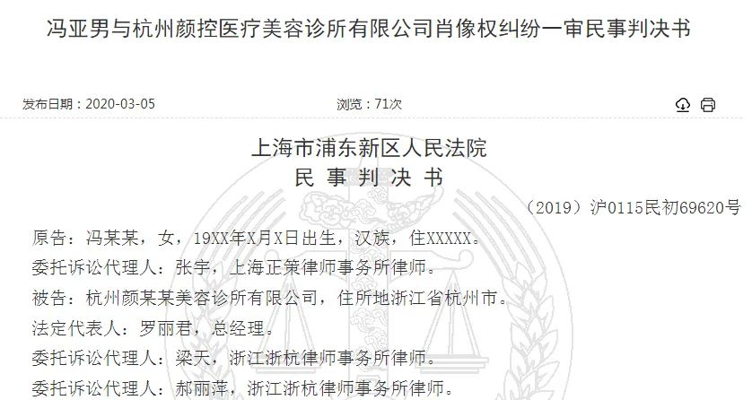 2019年3月,原告冯亚男(艺名冯提莫)发现,杭州某整形医院未经允许,擅自把其正面肖像照片一张用于其经营场所的接待大厅内。遂以侵害肖像权为由,要求美容诊所公开赔礼道歉,并索赔经济损失100万元、精神损害抚慰金5万元。