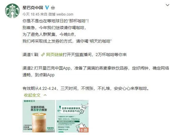 除此之外,星巴克这一行动还通过天猫线上直播和明星代言增加了关注度,根据星巴克官方微博此前发布的活动通告,从4月21日晚8时,星巴克将送出2万杯免费咖啡礼券,只要在当晚8点打开星巴克App,就有机会获得礼券,礼品券兑换有效期为4月22日至4月24日。