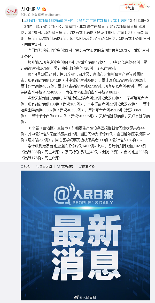 4月18日0—24时,31个省(自治区、直辖市)和新疆生产建设兵团报告新增确诊病例16例,其中9例为境外输入病例,7例为本土病例(黑龙江6例,广东1例);无新增死亡病例;新增疑似病例2例,其中1例为境外输入疑似病例,1例为本土疑似病例(内蒙古1例)。