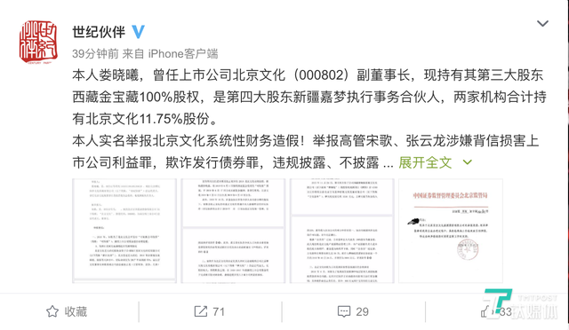 4月29日晚上7点29分,自称为北京文化原副董事长娄晓曦的微博用户“世纪伙伴”,通过微博实名举报北京文化系统性财务造假,并称高管宋歌、张云龙涉嫌背信损害上市公司利益罪,欺诈发行债券罪,违规披露、不披露重要信息罪,职务侵占罪。