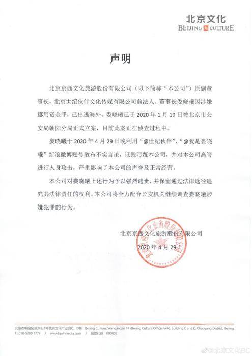 29日晚,《战狼2》《流浪地球》出品方 北京文化 发布声明,回应娄晓曦实名举报公司财务造假:公司原副董事长娄晓曦因涉嫌挪用资金罪,已出逃海外。娄晓曦已于1月19日被北京市公安局朝阳分局正式立案,目前此案正在侦査过程中。娄晓曦于4月29日晚利用“@世纪伙伴”“@我是娄晓曦”新浪微博账号散布不实言论,诋毁污蔑公司。公司对娄晓曦上述行为予以强烈谴责,并保留通过法律途径追究其法律责任的权利。公司将全力配合公安机关继续调查娄晓曦涉嫌犯罪的行为。