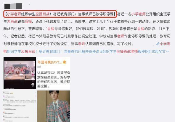 本来以为事情就这样结束,没有想到又有肖战的粉丝出来搞事情,因为有一个小学老师特别喜欢肖战,更是组织全班学生为偶像应援并且拍摄了短视频,当时消息曝光之后,在整个教育界都造成了很大的影响,把学生们当作给偶像应援的工具,也遭到不少网友的炮轰,后来,这位小学老师已经遭到学校停职。