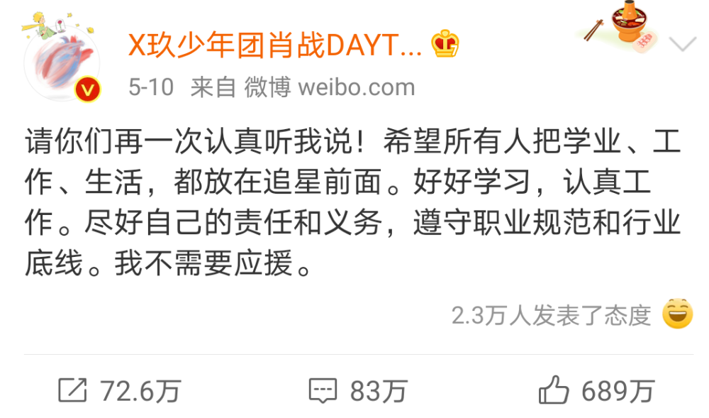 随后,肖战再次发声,但这一次直接引用了官媒评价当中的一句话,表示:职业底“线”不能破,理性之“圈”不能出,饭圈不能圈一切。