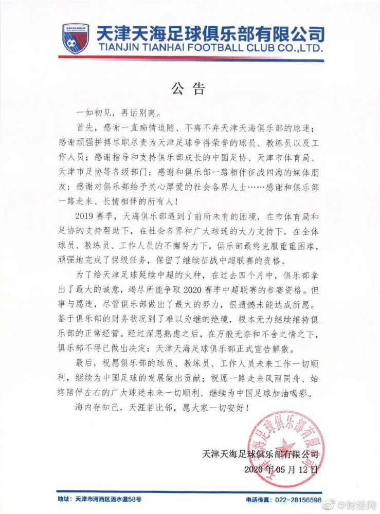 2020年5月12日,中超天津天海俱乐部官方宣布:鉴于俱乐部的财务状况到了难以为继的绝境,球队正式解散!