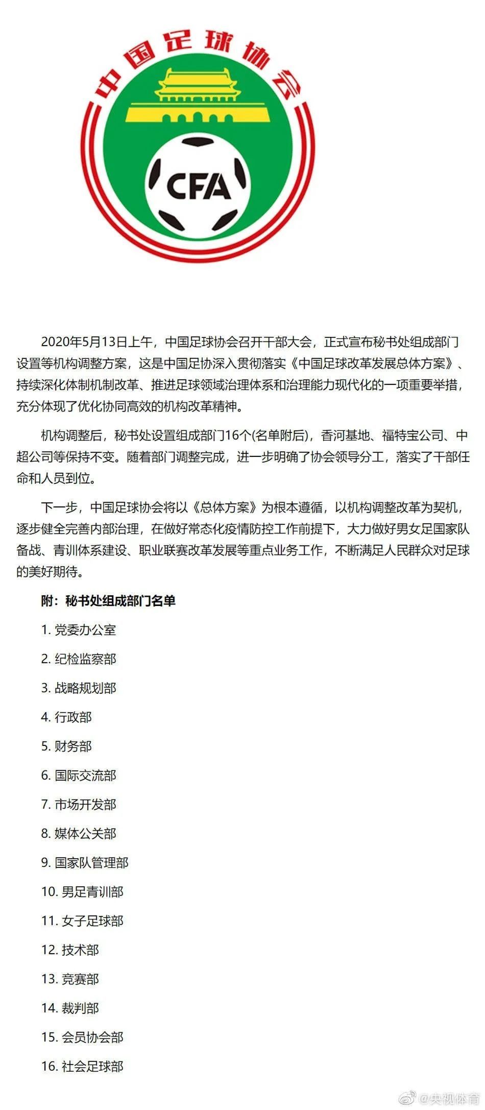 13日,中国足协正式宣布秘书处组成部门设置等机构调整方案,秘书处由原来的28个部门调整为16个,同时香河基地、福特宝公司、中超公司等保持不变。