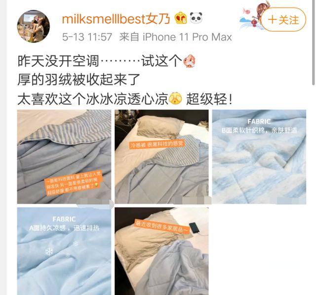 而今天张大奕的文案写着"昨天没开空调",给大家分享了正在使用的空调被,称"冰冰凉透心凉","超级轻",并配图五张。她拍摄了自己的床品,有些凌乱的床显得非常日常,她特别提到的空调被看着也是十分柔软舒适,再配以产品的材质介绍,为网友种草了一款好物。