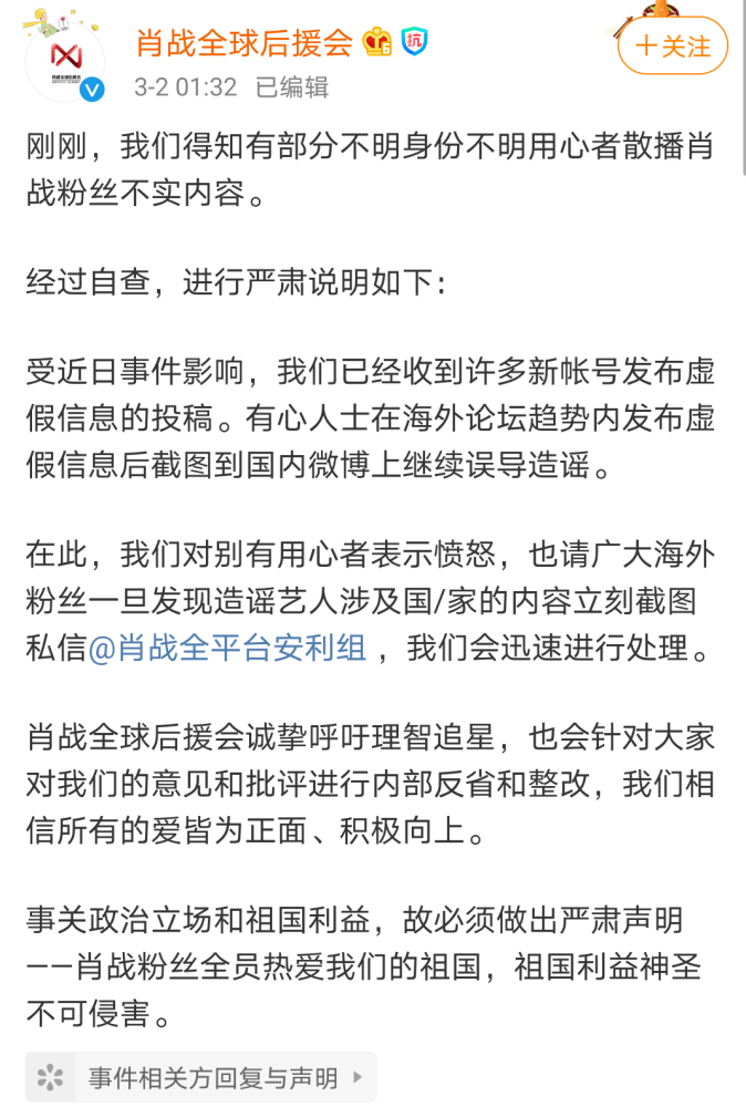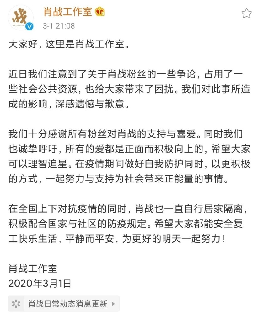 尽管在事后第一时间肖战工作室和粉丝后援会以及作为导火索的粉丝先后发表声明和道歉,但网友们并没有谅解,而且作为当事人的肖战也没有发声,如同人间蒸发一样,社交平台上也没有任何的更新动态,更是遭到不少网友的炮轰。