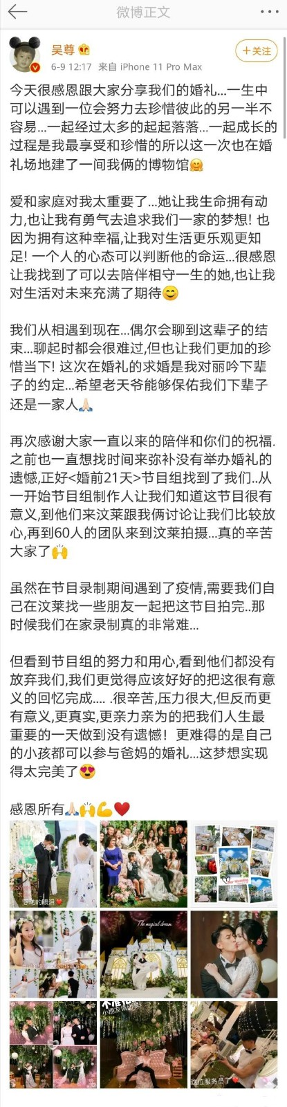 6月9日,吴尊在个人社交平台分享了自己的婚礼现场。留言让人感到爱情的距离,有时就是离你这么近。