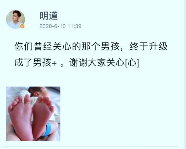 面对诸多爆料和热议,明道的经纪人李诗翔也承认了该报道,并透露明道在去年已低调结婚;因为自己的哥哥在去年带着老婆儿子轻生,所以为了不刺激父母,明道才考虑低调处理;最后,新手爸爸明道也发文证实消息,并配文道:“你们曾经关心的那个男孩,终于升级成了男孩+ 。谢谢大家关心”,并附上儿子的脚掌照片;从图片上看,儿子头发很茂盛,整个红彤彤显得非常讨喜!