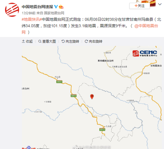 中国地震台网正式测定:06月08日02时38分在甘肃甘南州玛曲县(北纬34.05度,东经101.15度)发生3.1级地震,震源深度9千米。( @中国地震台网 )