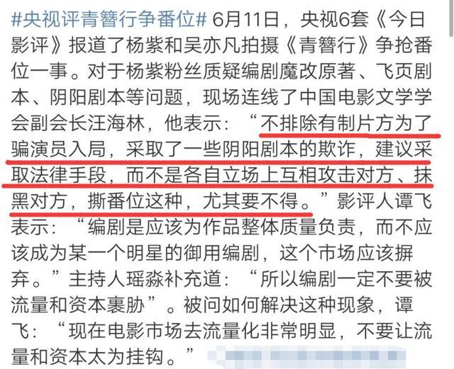 CCTV6最近就《青簪行》撕番和阴阳剧本的事情又一次做了点评。其中编剧汪海林在连线中表示不排除有些制片方为了骗演员入局使用阴阳剧本,这种情况下建议演员采取法律的武器维护切身利益。