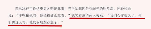 这篇文章还提到范冰冰和经纪人穆晓光的传闻,甚至还称范冰冰和穆晓光曾在车内缠绵,后来李晨和范冰冰交往的时候,范冰冰和穆晓光还是举动亲密,暗示李晨被戴了绿帽。