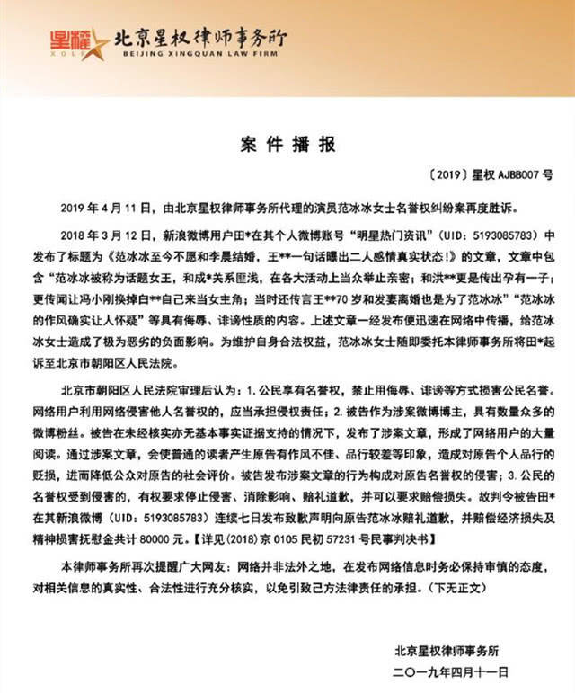 实际上这些谣言范冰冰已经多次辟谣,之前的造谣者也被范冰冰告上法庭,范冰冰当时胜诉获赔8万元。这次又有人再度造谣,不知道有没有准备好钱赔偿,范冰冰工作室对于造谣生事的人基本不会姑息,会用打官司来维护范冰冰的名誉权。