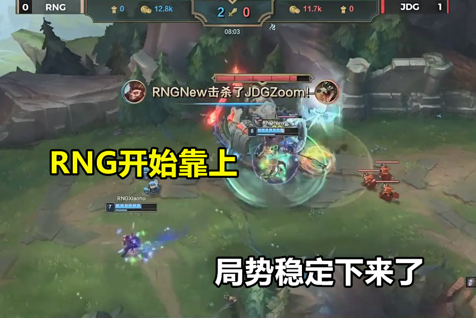 香锅看到后也是直呼:哇哦,这是猴王!在这之后,RNG的形势算是稳定下来了,因为new这边拿到了优势,小龙堡可以安稳控下上河蟹。而小虎的发条也开始靠上游走,在new压线之际,小虎直接从野区绕了过来,一发QR拉回鳄鱼,随后自己抗塔,让new入塔拿到鳄鱼击杀,猴哥发育更好了。而在峡谷先锋的争夺中,RNG打出1换1,并且逼退了JDG,令其无法捡到峡谷先锋。