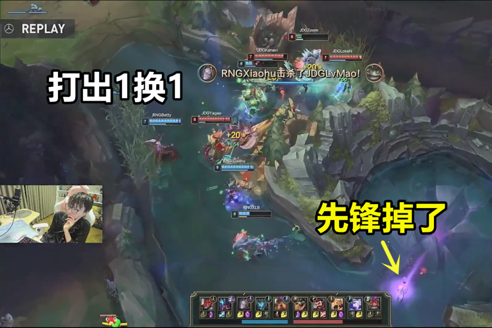 按理来说,这波算是不亏的,但小龙堡入龙坑想要绕后开团的一波动向,却被kanavi直接逮到,白白送出一个击杀,不过还好,JDG没能捡到先锋。而第二波先锋团战,RNG先动手交出大量技能,但却没留下一人。后续寒冰一个大招射中小虎,小虎直接白给,RNG再次丢失一个先锋。不过还好,RNG单抓做得不错,在JDG鳄鱼单带之时,小虎与小龙堡拿到鳄鱼击杀,算是帮小虎发育了一波。