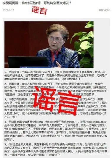 最近网上出现一篇署名李兰娟院士的文章《李兰娟提醒:北京新冠疫情,可能将全面大爆发》。针对这篇文章,6月17日,中国工程院院士、国家卫生健康委高级别专家组成员李兰娟院士向健康时报记者表示,这篇文章的内容根本不出自她本人,她从未表述过这样的观点,文章的观点也和她本人的观点不相符。