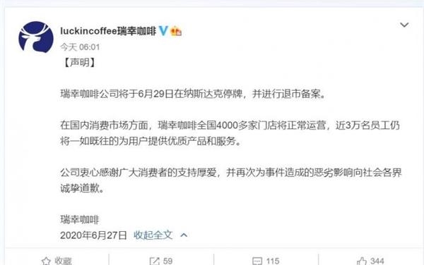6月27日一早,瑞幸咖啡公司发布官方声明称,将于6月29日在纳斯达克停牌,并进行退市备案。在国内消费市场方面,瑞幸咖啡全国4000多家门店将正常运营,近3万名员工仍将一如既往的为用户提供优质产品和服务。公司衷心感谢广大消费者的支持厚爱,并再次为事件造成的恶劣影响向社会各界诚挚道歉。