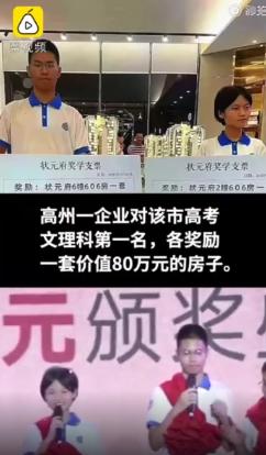 8月29日,广东高州一企业奖励2名高考学霸各一套新房。企业员工称,公司为中考、高考等学霸考生共提供300万元奖励,其中高考文理科第一名奖励房子,其他为奖励现金。当地教育局表示,该奖励是企业行为,并非教育局奖励。