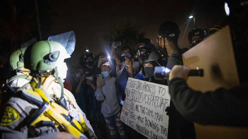 当地时间8月31日晚,美国洛杉矶县,一名非裔男子被两名警员枪杀后,抗议者和警员对峙。