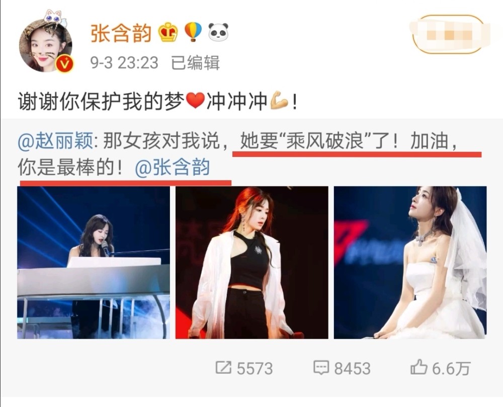 其中赵丽颖发文说:“那女孩对我说,她要乘风破浪了!加油,你是最棒的”,以赵丽颖的网络号召力,她肯定给张含韵拉不少票。看到赵丽颖发文打call,张含韵很感动地回应对方:“谢谢你保护我的梦想”,2位女星的互动太暖了,彼此是多年好友,在2015年,赵丽颖张含韵还一同参加了综艺《偶像来了》,2人在节目里是一对可爱的CP,经常互怼对方,赵丽颖调侃张含韵是“死胖子”、长得一身贵气。