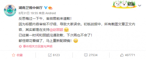 《中餐厅》发布节目战报pr中被发现有赵丽颖的黑帖内容,引发粉丝质疑。晚上,节目组发微博道歉, 因为标题内容审核不仔细,导致大家误会。初版战报中,所有截图文章正文内容其实都是在支持赵丽颖,已经第一时间和丽颖沟通致歉,下次再也不会了!都怪眼花看错了,马上重新配眼镜!