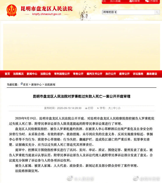 【李心草溺亡案将择期宣判,告当庭认罪】据昆明市盘龙区人民法院官网,2020年9月19日,昆明市盘龙区人民法院公开开庭,对昆明市盘龙区人民检察院指控被告人罗秉乾犯过失致人死亡罪、附带民事诉讼原告人陈美莲提起的附带民事诉讼案进行了审理。 盘龙区人民检察院指控,被告人罗秉乾邀约饮酒,在被害人李心草醉酒后出现严重危及自身安全的异常行为时,未采取合理、有效的看护、救助措施,未尽到应负的注意义务,反而实施俯身贴近、掌掴李心草等不当行为,致使李心草情绪、行为失控,翻越护栏,造成坠江溺亡的严重后果,犯罪事实清楚,证据确实充分,应当以过失致人死亡罪追究其刑事责任。 被告人罗秉乾当庭表示认罪认罚。法院将择期宣判。