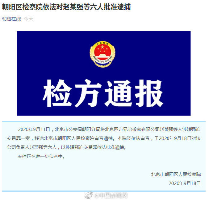 【北京四方兄弟搬家公司6人被批捕】据北京市朝阳区人民检察院官方公众号“朝检在线 ”18日通报:2020年9月11日,北京市公安局朝阳分局将北京四方兄弟搬家有限公司赵某强等人涉嫌强迫交易罪一案,移送北京市朝阳区人民检察院审查逮捕。本院经依法审查,于2020年9月18日对该公司负责人赵某强等六人,以涉嫌强迫交易罪依法批准逮捕。案件正在进一步侦查中。