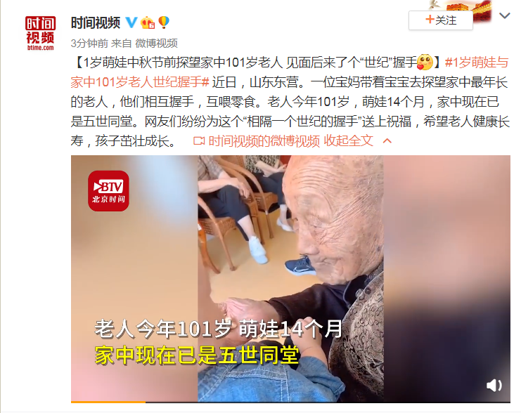 近日,山东东营。一位宝妈带着宝宝去探望家中最年长的老人,他们相互握手,互喂零食。老人今年101岁,萌娃14个月,家中现在已是五世同堂。网友们纷纷为这个“相隔一个世纪的握手”送上祝福,希望老人健康长寿,孩子茁壮成长。