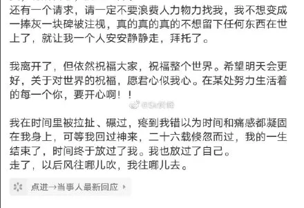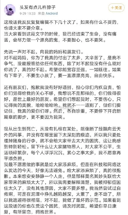 虎扑10月5日讯 近日,26岁辽宁女孩在微博上发布千字 遗书 后,警方回应已查到上山记录,不确定是否有自杀行为。新闻发出后引发网友广泛关注,具体内容如下: