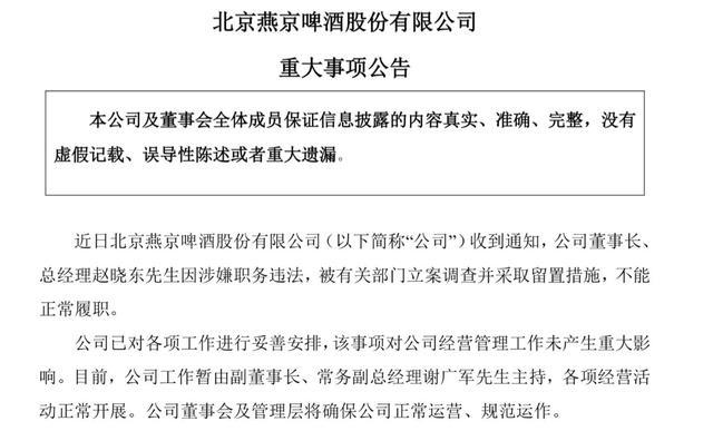 10月8日,北京燕京啤酒股份有限公司发布重大事项公告,公告表示,近日燕京啤酒收到通知,公司董事长、 总经理赵晓东先生因涉嫌职务违法,被有关部门立案调查并采取留置措施,不能正常履职。