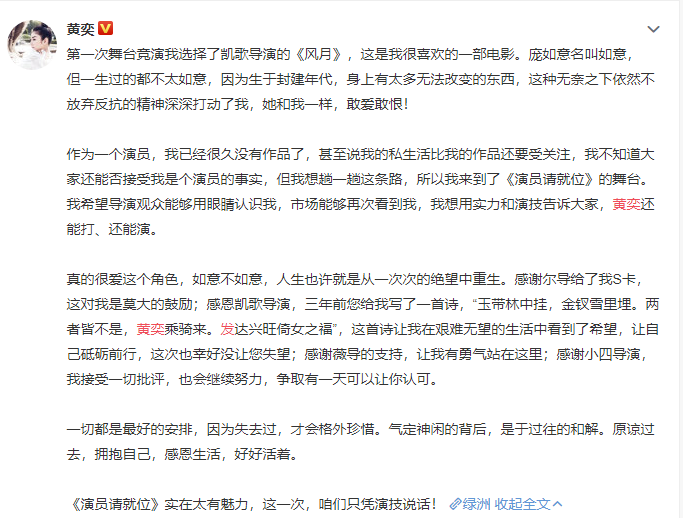 最近黄奕在《演员请就位2》中亮相。而在今天,她更是发表长文,讲述了自己参加节目的心情。她在文中提到自己很久没有作品了,大部分都觉得她的私生活比她的作品更受关注。而她更希望用实力和演技告诉大家,她还能打,还能演。