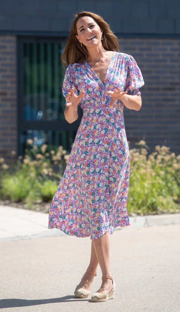 在去一个儿童收容所探望那些失去父母的孩子时,凯特穿了这些满是花朵的长裙,搭配了浅色松糕鞋,这身衣服既显出当时的季节,同时也非常实用,因为当天她的那里的小朋友 一些做了一些活动,其中包括种花弄草,在花园里的凯特当天确实像只美丽的蝴蝶般,这对孩子们来说确实很温暖。