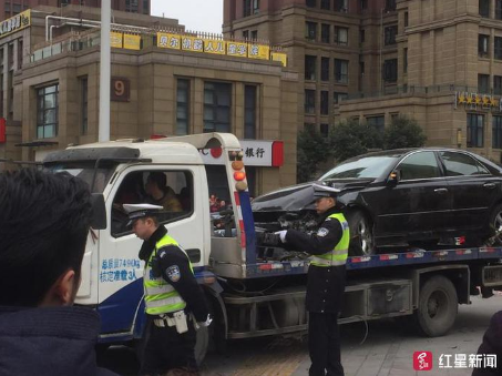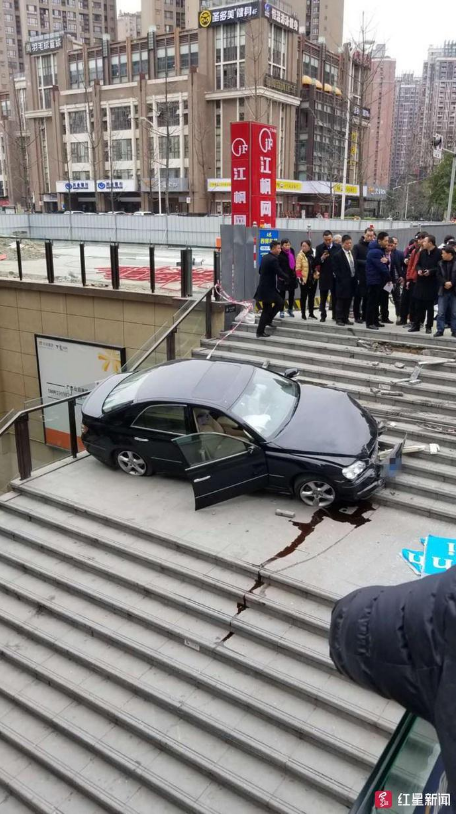 下午3时许,记者赶到事发现场。现场拉起了警戒线,不少路过市民在线外围观。白色轿车正被拖离,丰田轿车仍在下沉广场的阶梯上,一辆吊车正准备起吊车辆。据了解,现场有一名男子受伤送医。