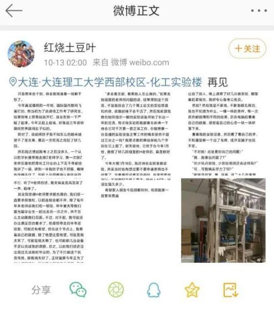 今日大连理工大学通报一起令人悲痛的事情,一名研究生在实验室自缢身亡了,自杀前把遗书放在了微博上。