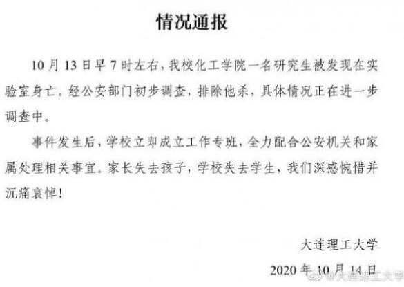 14日,大连理工大学发布情况通报,