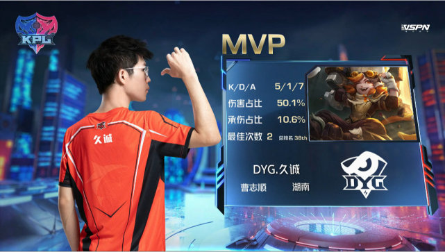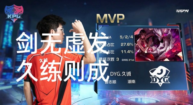 在决胜局久诚时隔四个月拿出了自己的招牌英雄干将莫邪,虽然在赛后采访中久诚透露近期没怎么练过干将莫邪,但在赛场上,他的干将莫邪技能精准,使对方虞姬没有生存的空间,助力队伍拿下比赛,而他本人也是拿到了MVP。