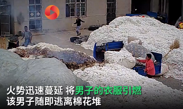 果,随后该男子下意识伸手从裤兜中掏出打火机,不假思索就去烧系包袱的绳子,棉花顿时起火,火势迅速蔓延,将男子的衣服引燃,男子随即逃出棉花堆。最终收购站满地的棉花被烧成了灰烬。目前暂无人员伤亡信息,具体情况正在核实中。