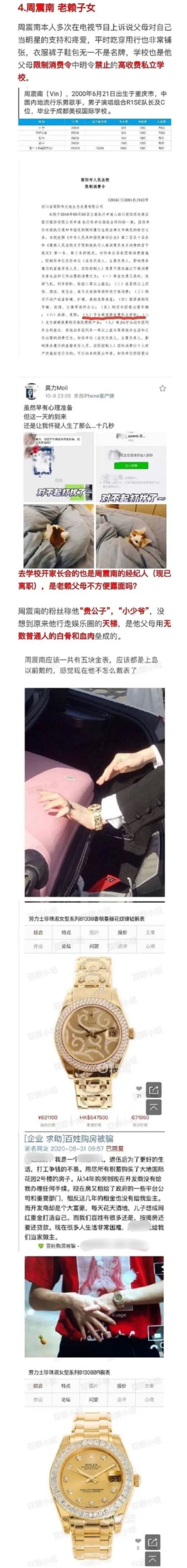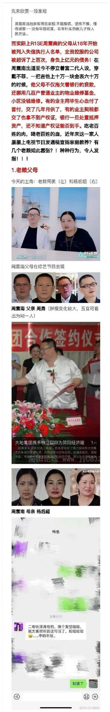 此前,在网友曝出的长图中可以看到,周震南的父亲周勇本人涉诉案件有8件,累计拖欠1亿元债款,至今未执行。周震南父母被曝不仅拖欠银行欠款还挪用几百户业主的维修基金费。而一直以来立着“富二代”人设的周震南的衣服和配饰都价值不菲,网友称周震南花的钱都是普通业主的血汗钱。