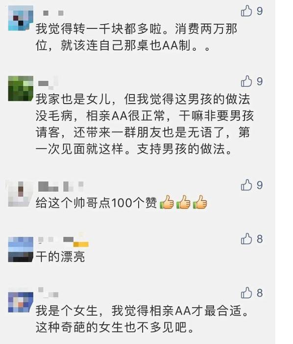 对于小陈的做法,小陈的妈妈并没有责怪,众多网友也觉得小陈做的很对,很漂亮。有网友评价:我家也是女儿,但我觉得男孩儿的做法没毛病,相亲AA很正常,干嘛非要女孩请客,还带来一群朋友也是无语了,第1次见面就这样非常不妥。大家怎么看呢?
