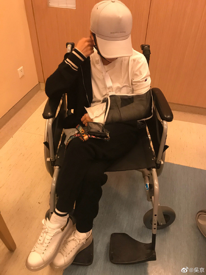 吴京晒出谢楠受伤照,照片中谢楠坐着轮椅,左手臂被固定夹板包裹着,她头戴鸭舌帽,微微低头,神情略微憔悴,其中通过吴京晒出的受伤彩超照,也看得出谢楠受伤很严重!