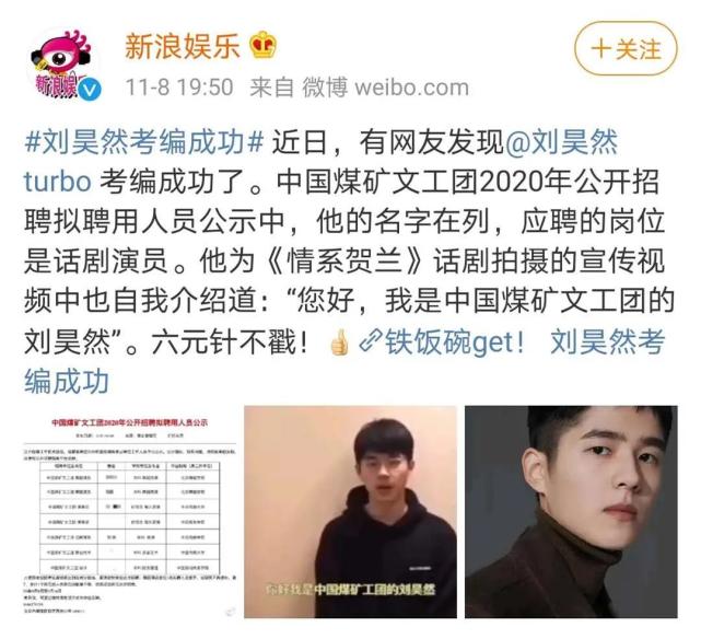 近日,有网友发现刘昊然在一则宣传片中介绍自己是“中国煤矿文工团”的刘昊然,随后就有网友发出了刘昊然考编成功的录取截图。