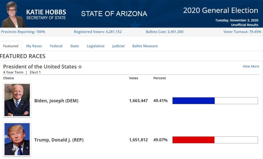 美国亚利桑那州务卿官网最新统计数据显示,拜登已正式赢下亚利桑那州。该州目前已完成选票统计工作,最终拜登支持率领先特朗普0.34个百分点。