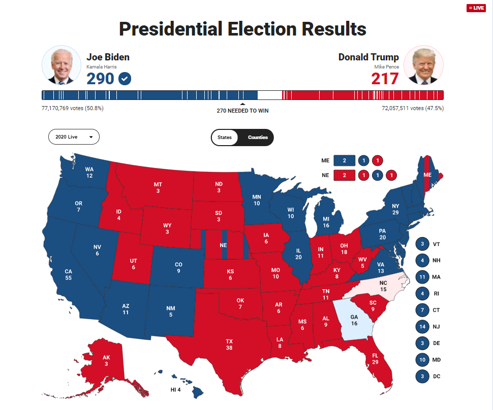 另据福克斯新闻统计数据,拜登目前已经获得了290张选举人票。